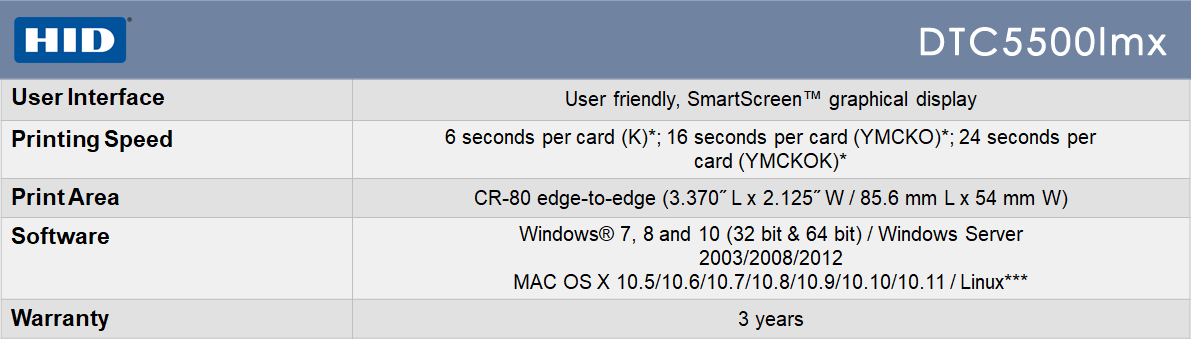 HID® Fargo® DTC5500lmx Specification![]() HID® Fargo® DTC5500lmx Features