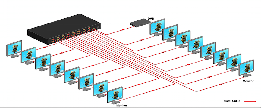 HDMI splitter that distributes one HDMI input into sixteen identical outputs supporting uncompressed 4K UHD resolutions. multi-channel digital audio to multiple display environments such as digital signage, hospitality markets, airports, shopping malls and medical imaging. |
