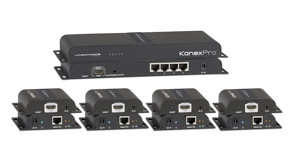 KanexPro HDMI® 1x4 Distribution Amplifier over CAT5e/6 Outputs Features Applications: Perfect for house of worship centers, retail stores and residential /smart home theater applications where one HDMI device can be distributed to four displays over a single network cable up to 394 ft. without losing signal integrity.
